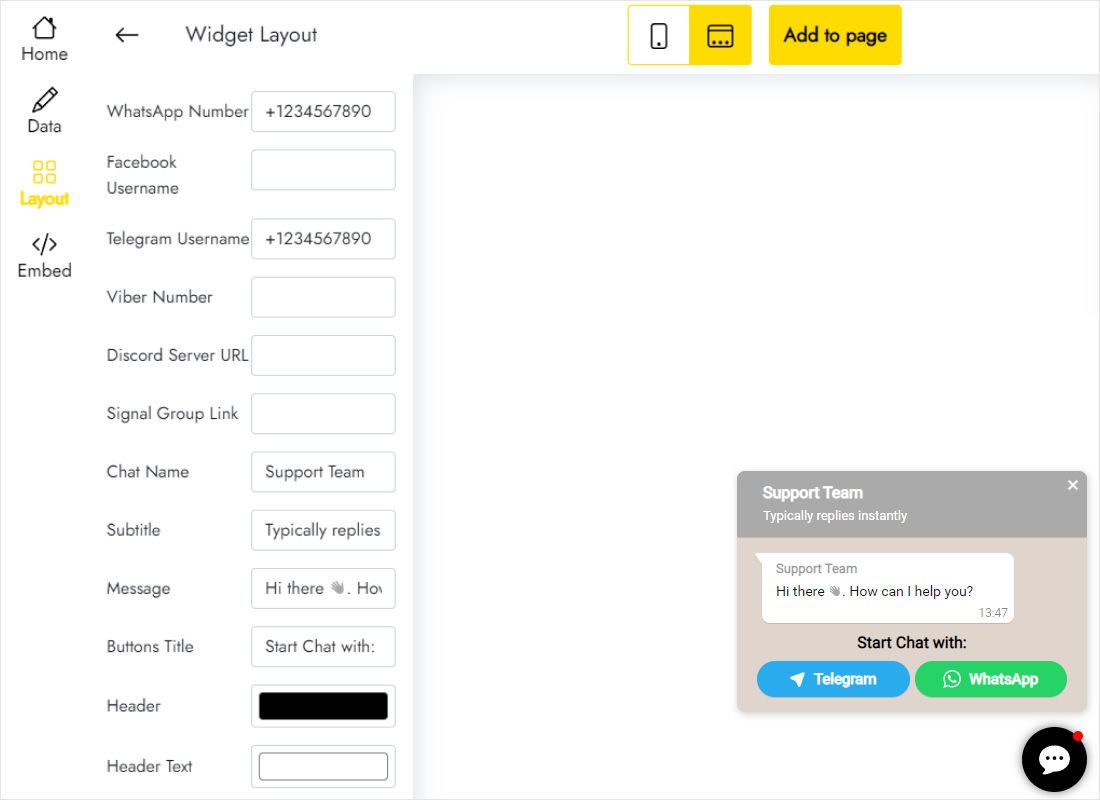 When your widget is ready, click on the Embed button. The code you see is ready to be added to the code of your page. Place it where you want to see your Popup Chat and save to see the result.